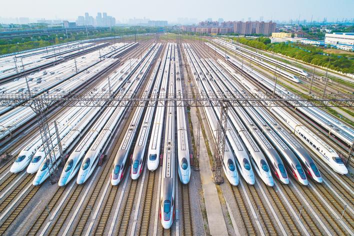 武漢動車段近百組動車組整齊停放,蓄勢待發。(湖北日報全媒記者 任勇 攝)