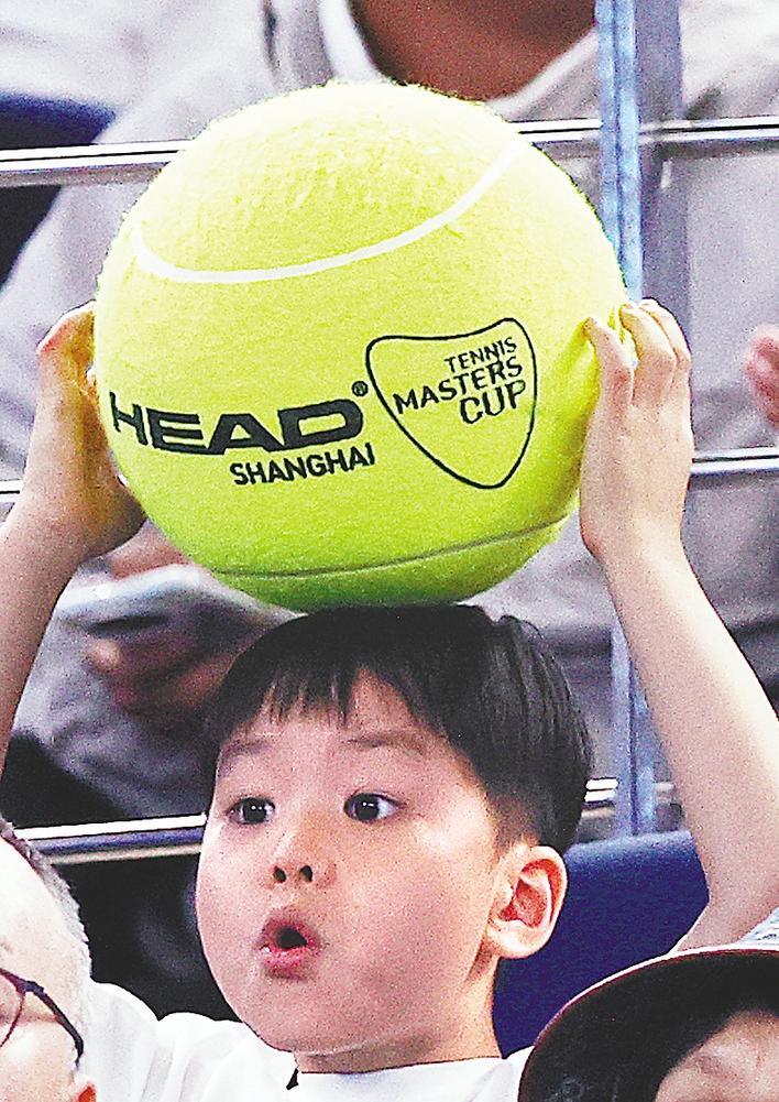 看臺上的小球迷每次看到精彩瞬間就“緊張”地舉起大號網球。