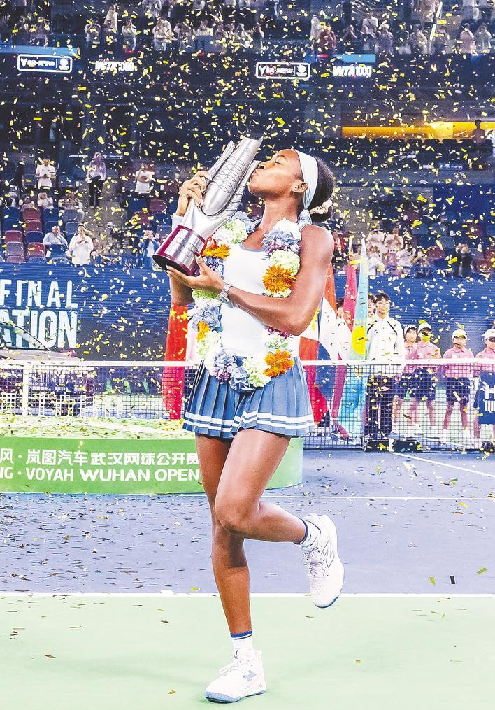 10月12日晚,高芙親吻武網冠軍獎杯。