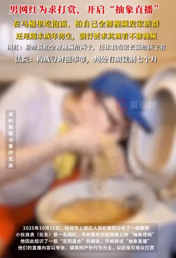 在紛繁復(fù)雜的網(wǎng)絡(luò)直播世界中,有人沉溺打賞,有人玩出花樣,刺激挑戰(zhàn)不斷刷新道德底線。2024年12月,浪浪和直播的同事一起來到杭州,利用某直播工作室的賬號,開啟了往常的“抽象直播”。2025年1月26日,因涉嫌尋釁滋事罪,浪浪被上城區(qū)檢察院批準(zhǔn)逮捕,同年4月27日起訴至法院。近日,法院判處其有期徒刑七個(gè)月。(據(jù)10月12日都市快報(bào)報(bào)道)