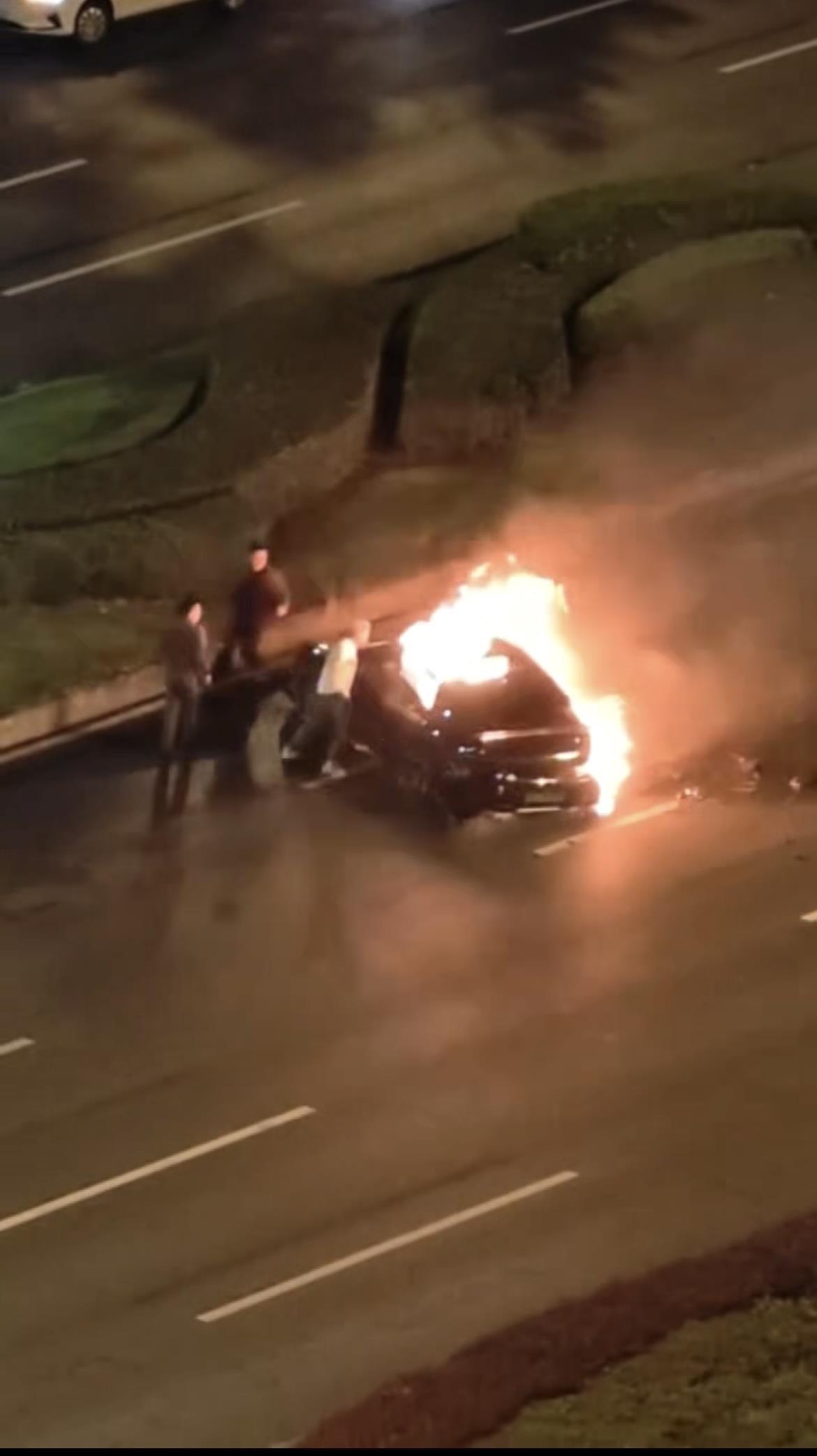 該市民發布的視頻中可見,小車車頭對著路邊花壇,一側火勢很大,多名路人參與救援,有人試圖拉門,有人用腳踹門,有人拿來車載滅火器,還有一名白衣男子急得徒手猛砸車窗,但均沒有成功。大火隨即蔓延到全車。