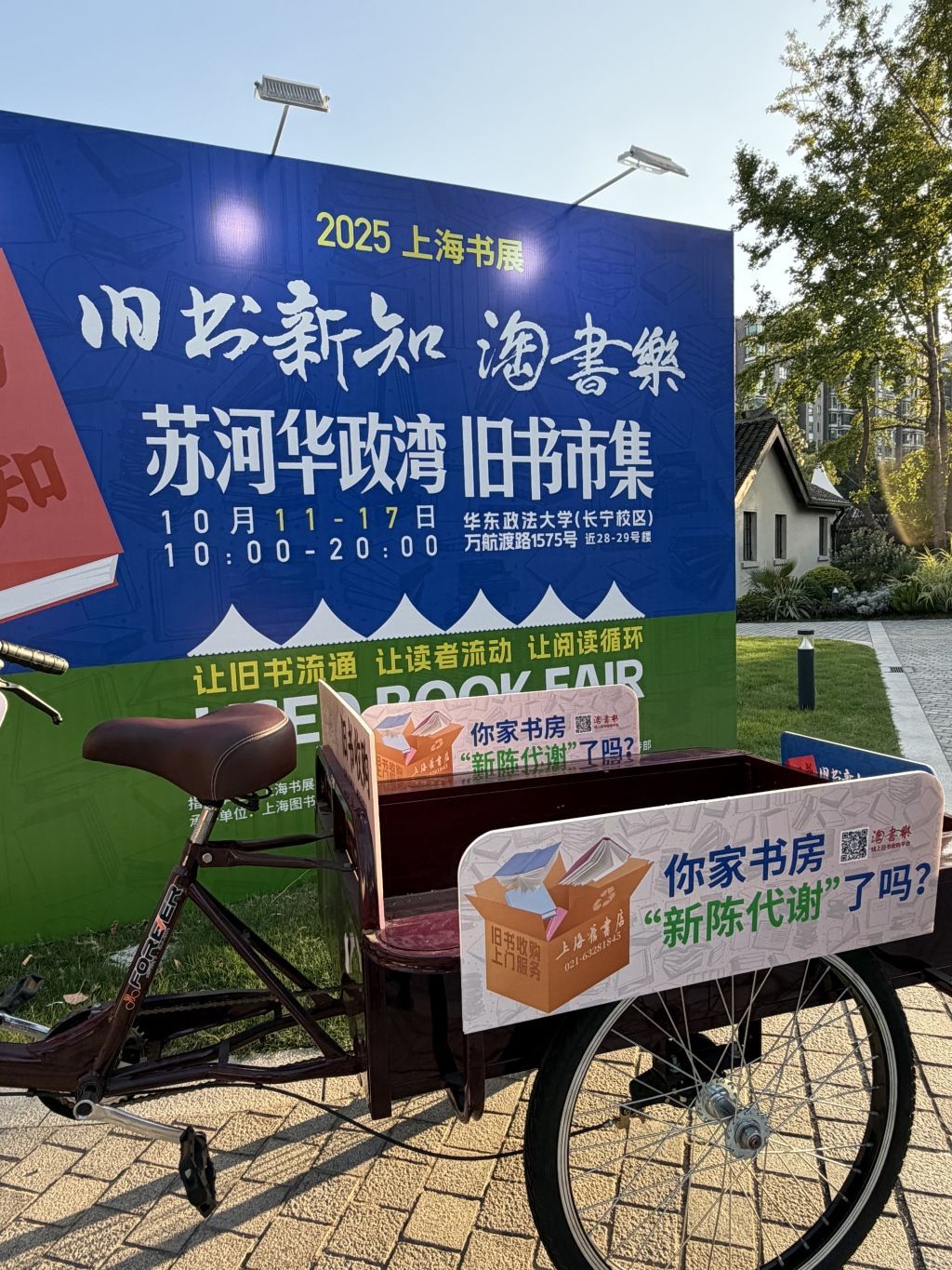 “舊書收購”服務(wù)與“書香車輪”流動平臺再次在淘書樂市集啟動,精準(zhǔn)覆蓋多元人群。“書香車輪”將復(fù)古懷舊的三輪車裝飾成迷你書屋,市集期間將穿梭往來于校園、社區(qū)之間,為高校師生、市民讀者提供更近距離、更便捷的舊書收購服務(wù)。“書香車輪”是對老上海走街串巷“收舊書”傳統(tǒng)的溫情致敬;而線上估價、預(yù)約上門等現(xiàn)代化服務(wù),則為這一傳統(tǒng)注入了當(dāng)代效率。無論是華政教授篋中的學(xué)術(shù)專著、周邊大學(xué)生的文學(xué)啟蒙讀物、中小學(xué)生的成長印記、以及社區(qū)居民承載著家庭記憶的舊書,都可在這個平臺重新進(jìn)入流通,匯聚成一幅生動的城市閱讀光譜。