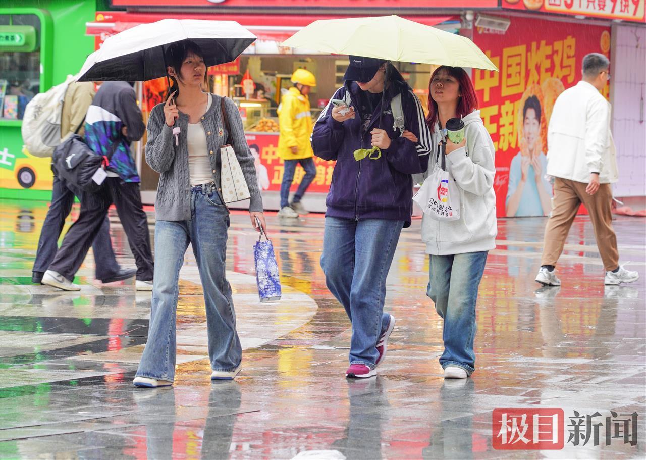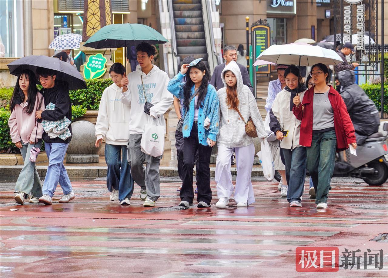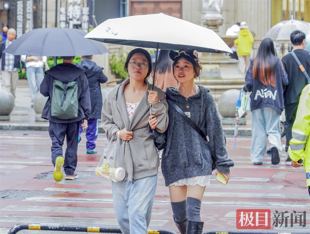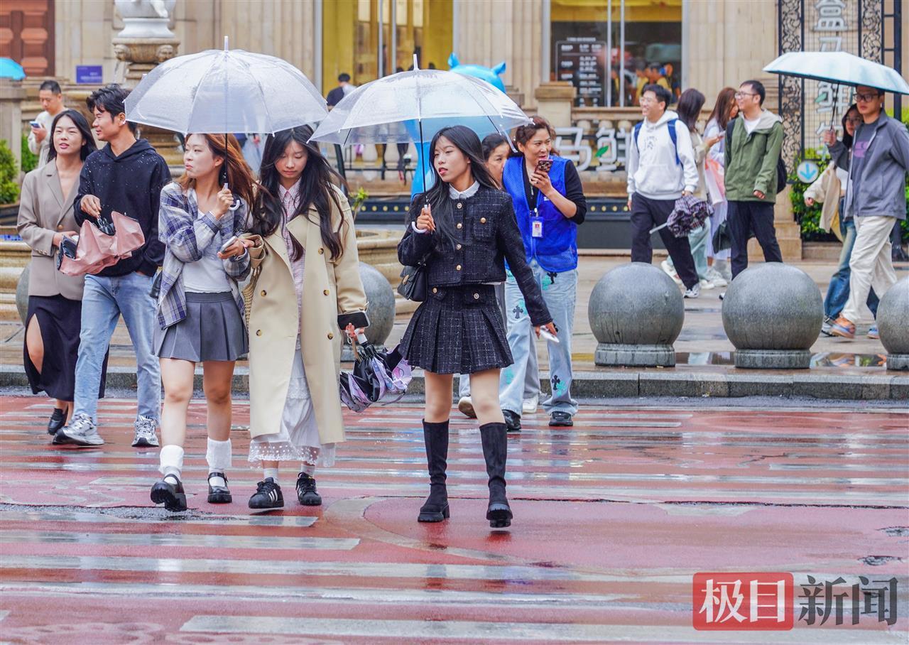 光谷步行街上,人們穿上了厚秋裝,抵御冷風(fēng)冷雨