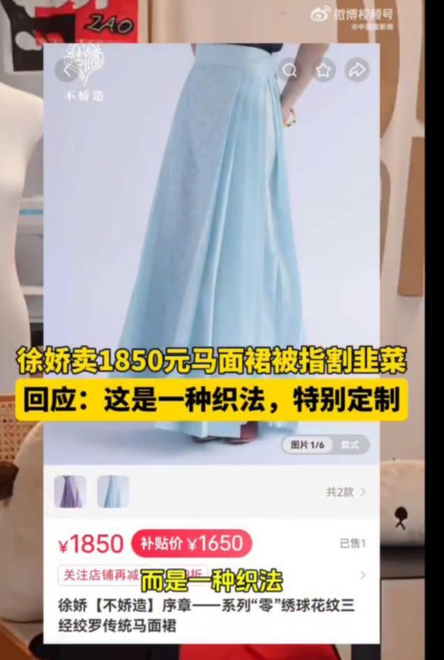 近日,徐嬌重啟漢服店,其中一款宣稱“一人一版”的馬面裙標價1850元。因宣傳中強調“綾羅綢緞”“花羅”等傳統材質,但商品詳情頁標注面料為100%聚酯纖維(化纖),引發網友質疑涉嫌“割韭菜”。