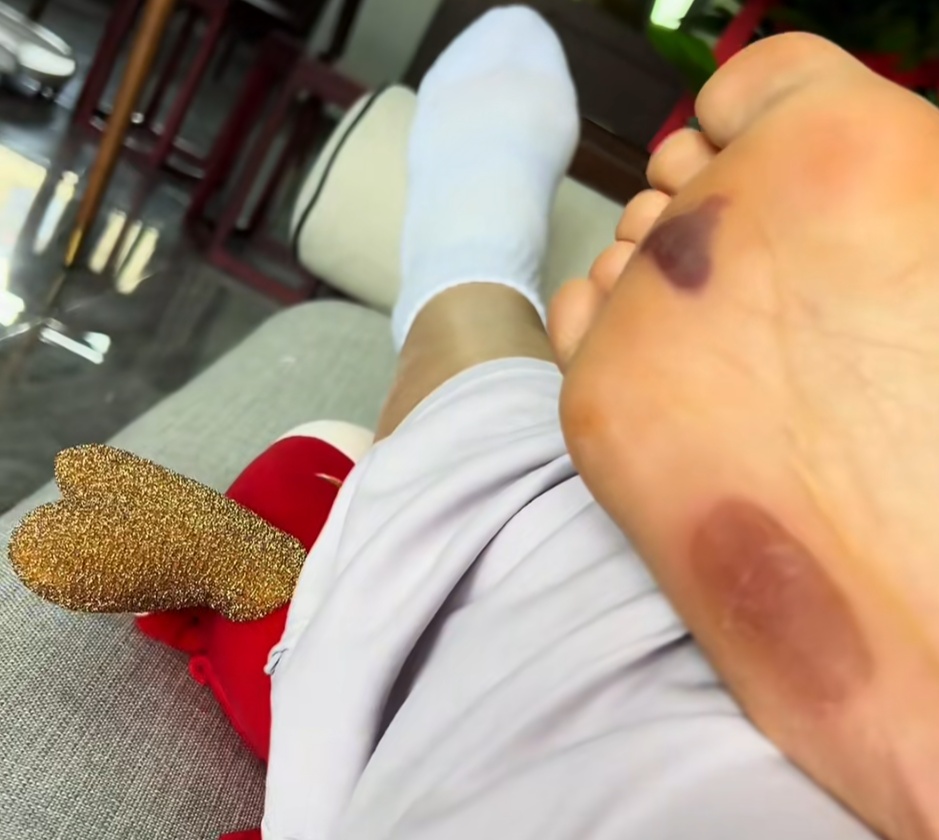 薛女士稱剛開始10多分鐘時感覺蠻有效果,到了15分鐘的時候疼痛加劇,但自己以為痛則不通,忍痛踩到20分鐘時腳底板突然噴血,發現有大面積血泡且有的已被磨破。