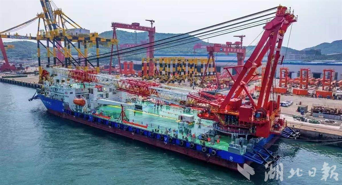 武漢船用機械有限責任公司海工平臺升降裝置A架可放倒式1000噸全回轉浮式起重機。(通訊員 王磊 攝)
