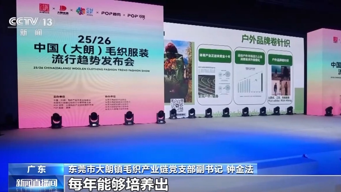 東莞市大朗鎮毛織產業鏈黨支部副書記 鐘金法:經過十多年的發展,大朗毛織已經有研發以及工藝設計技術人員3000名,每年能夠培養出設計方面的人才大概超過200人。