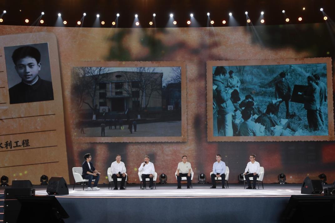 多名紅旗渠修渠人及其后代現場講述(從右往左分別為:紅旗渠景區演員、除險隊長任羊成外孫任斌強;紅旗渠支渠配套建設模范、鐵姑娘隊隊長郭秋英;紅旗渠建設特等模范、烈士張運仁之子張買江;紅旗渠灌區服務中心合澗渠管所所長、烈士張運仁之孫張學義;紅旗渠干部學院教師、林縣原縣長李貴曾孫女李媛)。主辦方供圖