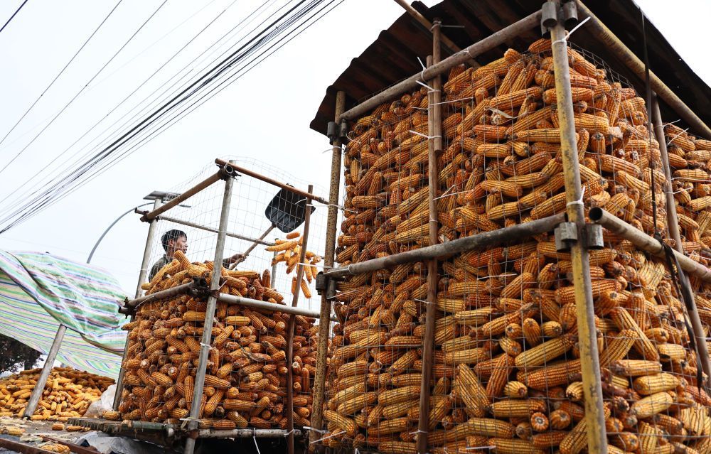 10月11日,山西省運城市新絳縣澤掌鎮(zhèn)澤掌村村民抓緊降雨暫停時段將收獲的玉米上架晾曬。新華社發(fā)(高新生 攝)