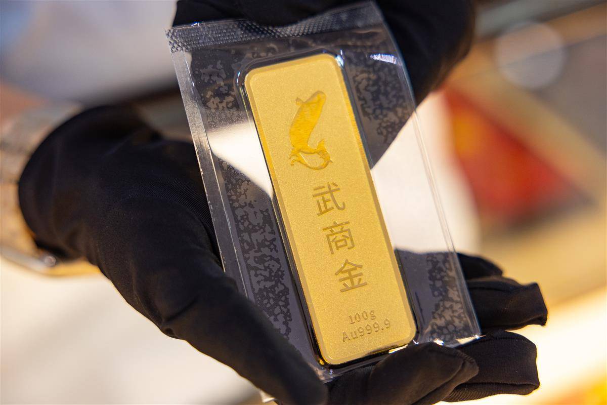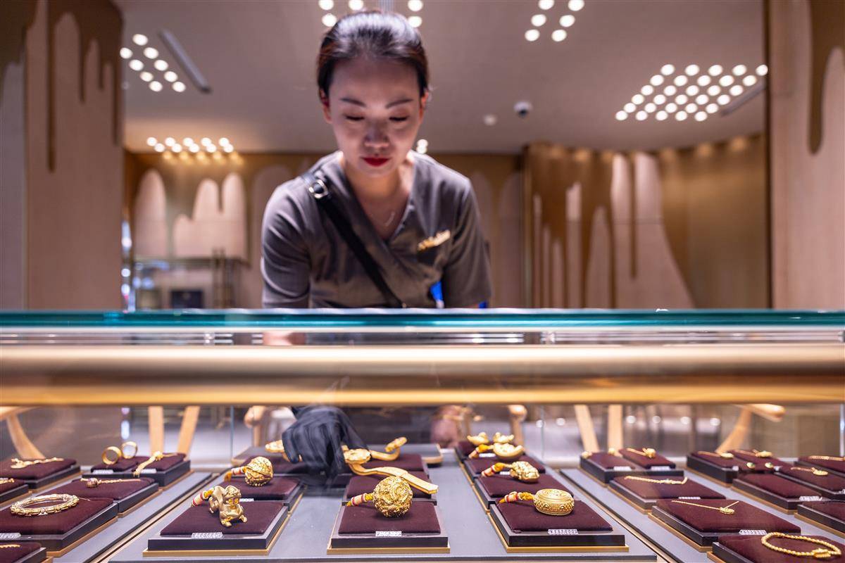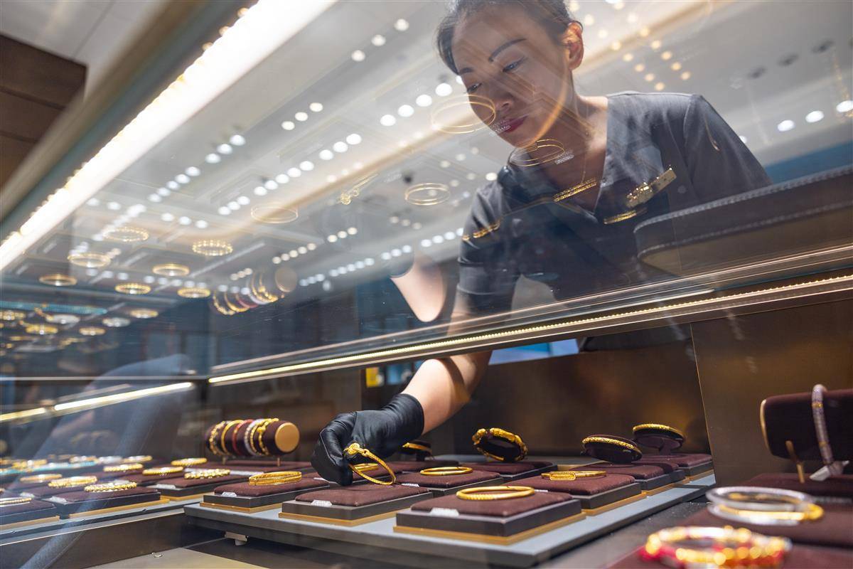 在武商MALL·世貿(mào)黃金珠寶區(qū),工作人員展示足金產(chǎn)品。