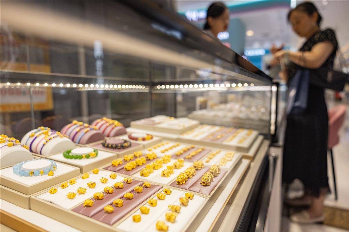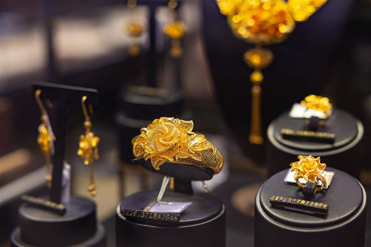 在武商MALL·世貿(mào)黃金珠寶區(qū),各種黃金飾品玲瑯滿目。