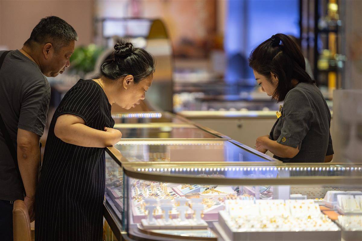 顧客在武商MALL·世貿(mào)黃金珠寶區(qū)內(nèi)選購金飾。