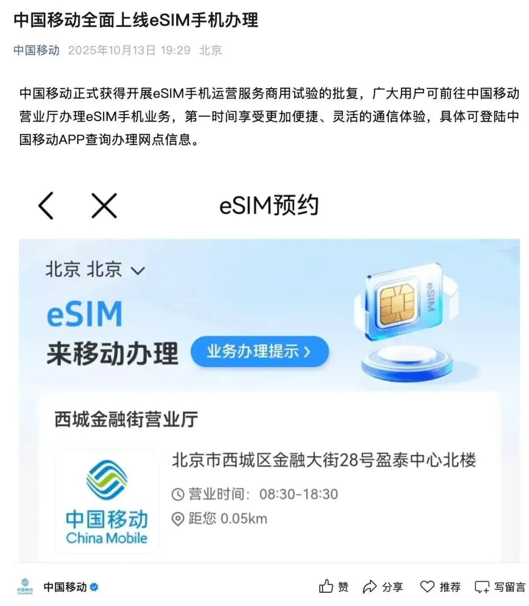 中國移動則表示,廣大用戶可前往中國移動營業廳辦理eSIM手機業務,具體可登陸中國移動App查詢辦理網點信息。
