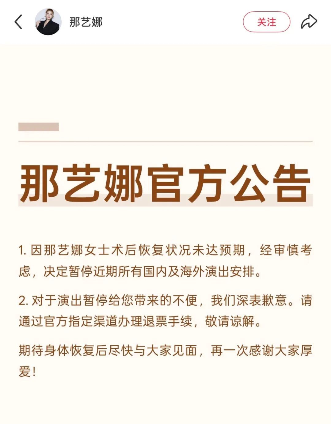10月13日,網紅女歌手那藝娜方發布官方公告:因那藝娜女士術后恢復狀況未達預期,經審慎考慮,決定暫停近期所有國內及海外演出安排。