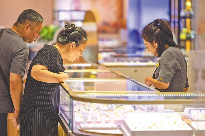 10月13日,現貨黃金升至每盎司4060美元,再創歷史新高。在武商MALL·世貿黃金珠寶區,不少品牌的黃金制品價格同步更新。圖為顧客在選購金飾。