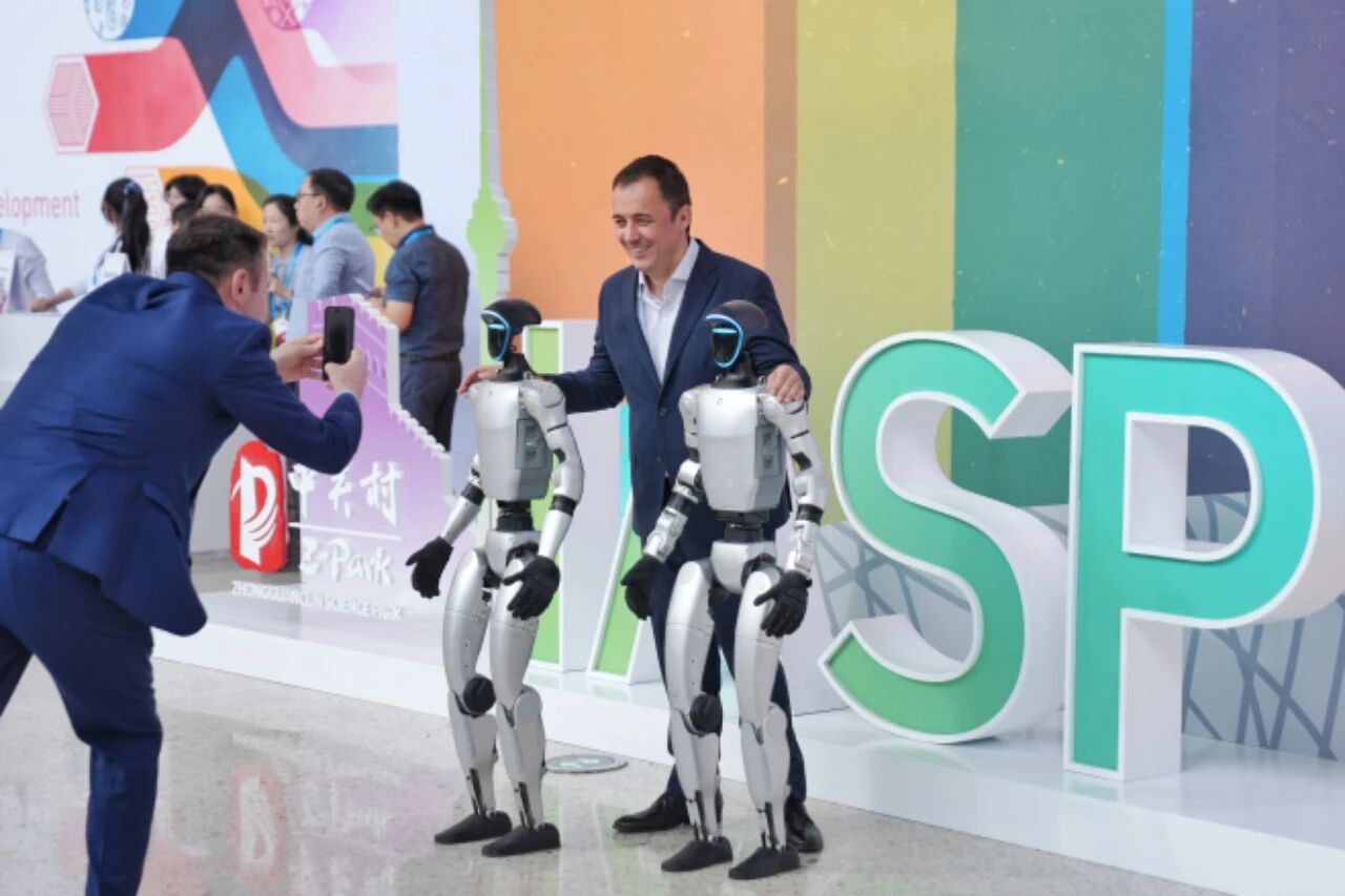 2025年9月17日,國際科技園及創(chuàng)新區(qū)域協(xié)會(IASP)2025年世界大會在北京國家會議中心開幕。圖為外籍嘉賓在大會現(xiàn)場同機(jī)器人合影。中新社記者 張祥毅 攝
