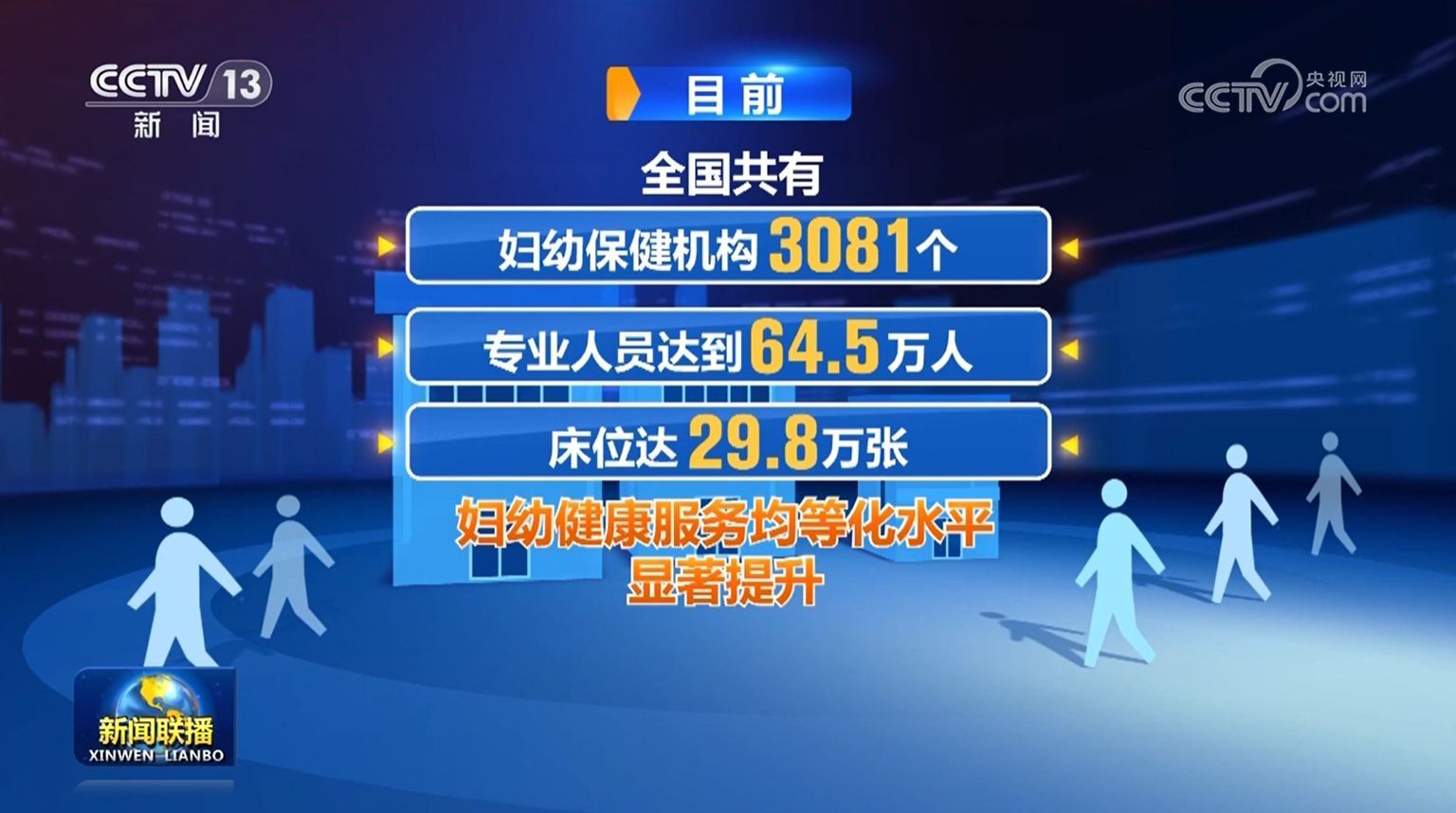 央視網消息(新聞聯播):記者從國家衛生健康委了解到,我國婦女健康水平大幅提高,婦幼健康核心指標位居全球中高收入國家前列,提前實現聯合國2030年可持續發展議程相關目標。我國已將婦幼保健服務網絡嵌入覆蓋14億多人口的醫療衛生保健網絡,建成以婦幼保健機構為核心、基層醫療衛生機構為基礎、大中型醫院和科研機構為支撐的婦幼健康服務體系。目前全國共有婦幼保健機構3081個,專業人員達到64.5萬人,床位達29.8萬張,婦幼健康服務均等化水平顯著提升。