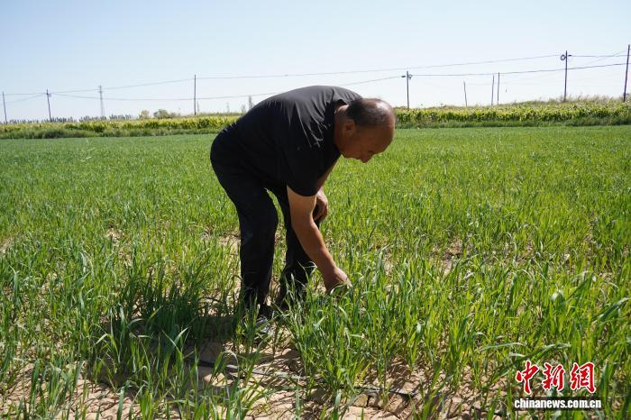 圖為許忠厚查看燕麥草生長情況。 侯旭佳 攝