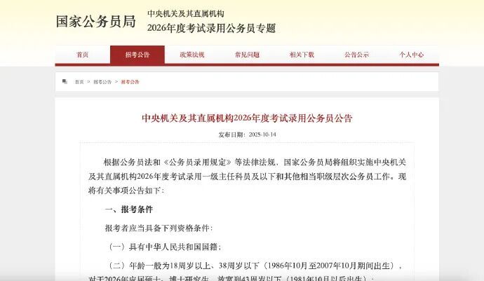 報(bào)名要求中,要求考生年齡一般為18周歲以上、38周歲以下(1986年10月至2007年10月期間出生),對(duì)于2026年應(yīng)屆碩士、博士研究生,放寬到43周歲以下(1981年10月以后出生)。