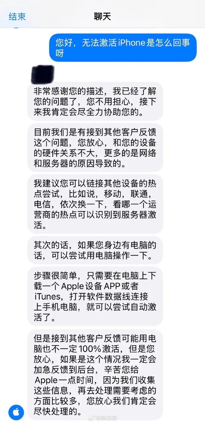 對此,蘋果官方工作人員表示,已接到其他客戶反饋,和設備的硬件關系不大,更多的是網絡和服務器的原因導致的,建議鏈接其他設備的熱點嘗試,并表示會肯定會盡快處理。