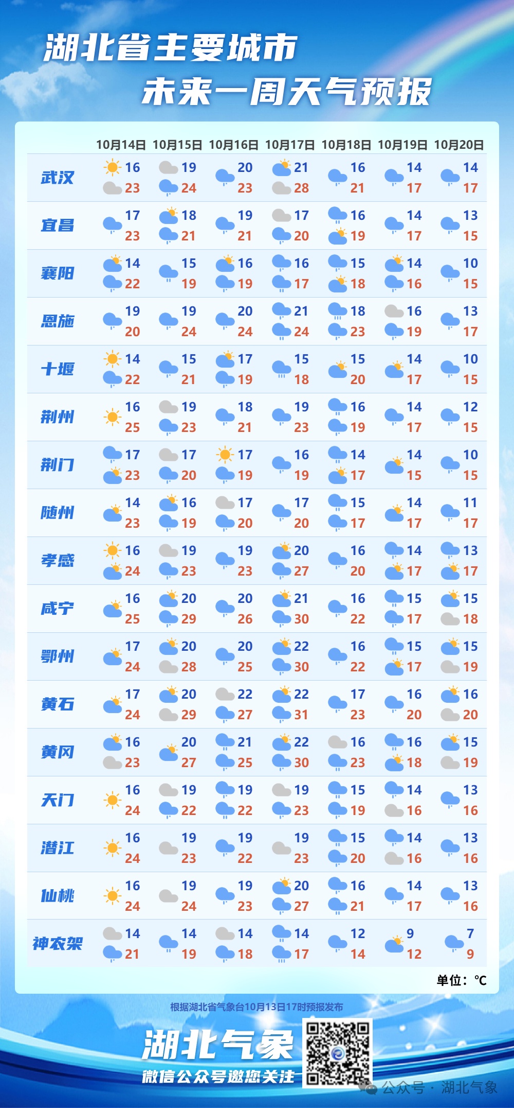 10月14日08時-15日08時,鄂西北、鄂西南陰天有中到大雨;其他地區多云到陰天,局地有陣雨。早晨省內局地有霧。最高氣溫20~25℃,最低氣溫14~18℃,偏北風2到3級。