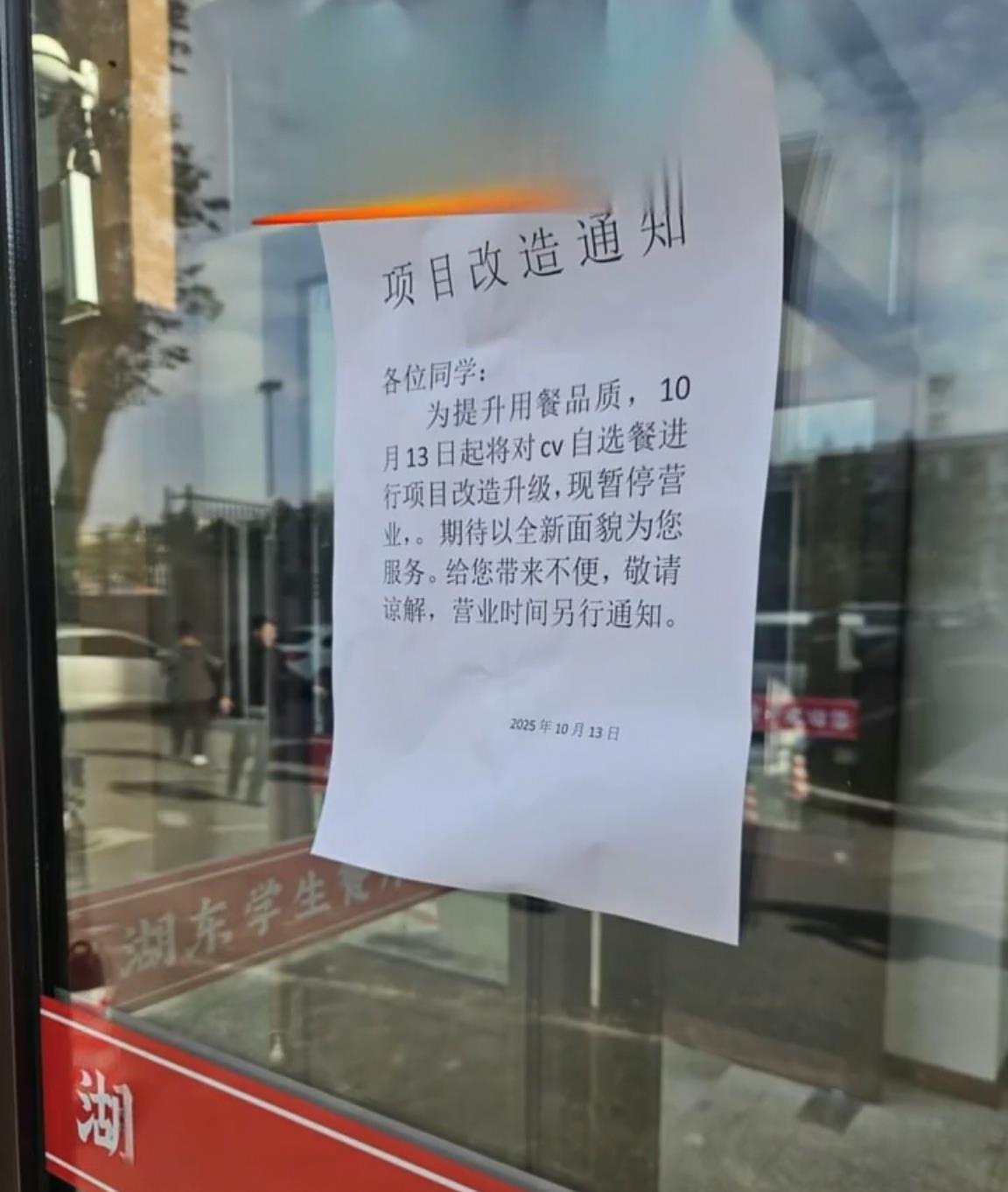 13日,該食堂貼出項目改造通知稱:為提升用餐品質,10月13日起,將對CV自選餐進行項目改造升級,現暫停營業。期待以全新面貌為您服務,給您帶來不便,敬請諒解,營業時間另行通知。