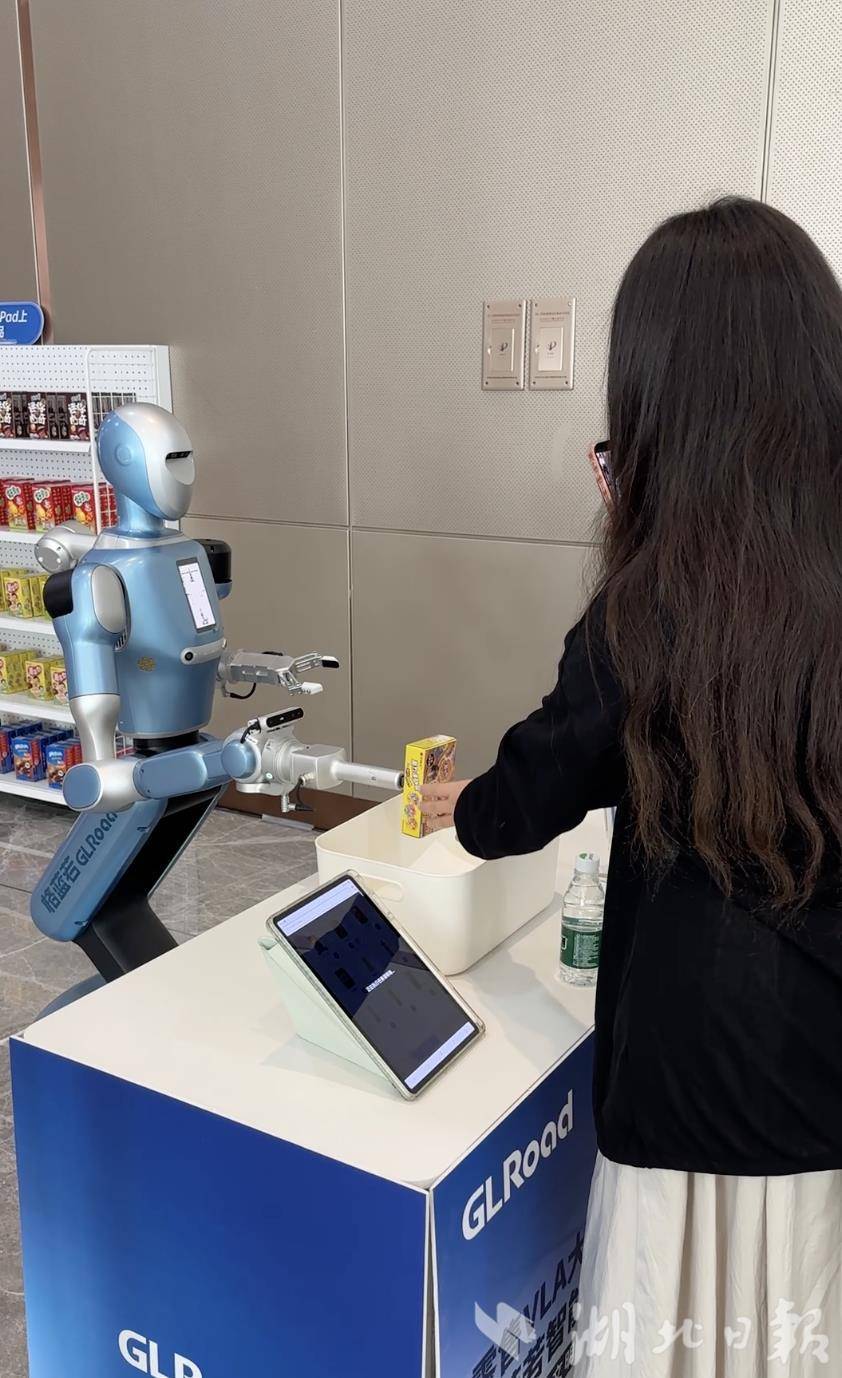 湖北日報訊(記者孫凌、實習生鄧婷婷)10月14日,“2025東湖論壇”現場,智能小賣部里機器人店員正為參會嘉賓服務。智能小賣部由武漢格藍若智能機器人有限公司搭建。該公司與華中科技大學陳學東院士團隊合作,開發出國內首款超高負載能力人形機器人。據介紹,其正在打造“勞動者”家族系列,覆蓋1.3米、1.7米、1.8米雙足機器人、四足機器人、輪式機器人等全產品形態,滿足多場景應用需求。不久,市民有望在景區和商場體驗到這一服務。