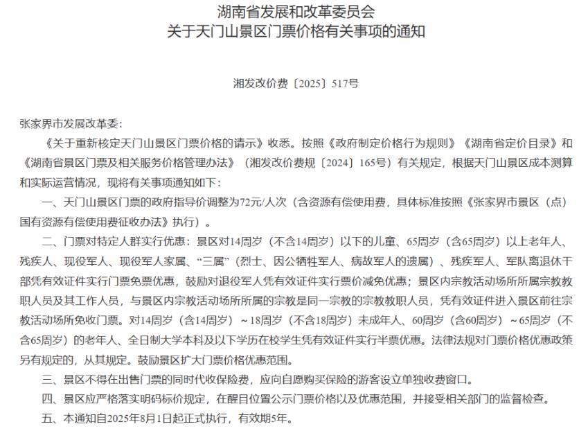 極目新聞記者搜索發現,2021年張家界市發改委發布的《張發改價費【2021】152號關于印發《張家界市政府管價景區目錄(2021年)》的通知》中明確,天門山景區淡旺季的門票價格均為62元/人次。同時,極目新聞記者還注意到,今年8月27日,湖南日報新媒體曾經發布一篇題為《最新!湘潭這個5A級景區門票有調整》的報道,稱8月25日,湖南省發展和改革委員會官網先后發布了關于滴水洞景區、炎帝陵景區、南岳大廟、天門山景區門票價格調整有關事項的通知。其中就有一份《湖南省發展和改革委員會關于天門山景區門票價格有關事項的通知》(湘發改價費〔2025〕517號),明確天門山景區門票的政府指導價調整為72元/人次(含資源有償使用費,具體標準按照《張家界市景區(點)國有資源有償使用費征收辦法》執行),并且明確本通知自2025年8月1日起正式執行,有效期5年。