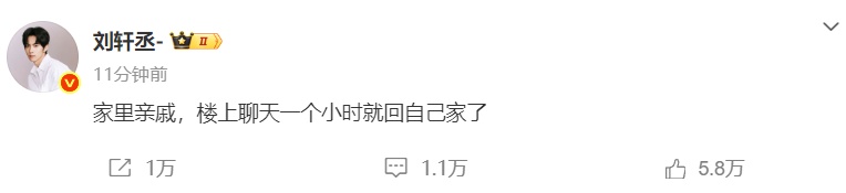 隨后,劉軒丞發(fā)文回應(yīng):“家里親戚,樓上聊天一個(gè)小時(shí)就回自己家了。”