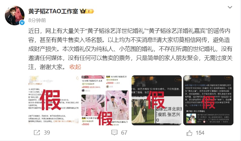 剛剛,黃子韜、徐藝洋工作室發文回應:近日,網上有大量關于“黃子韜徐藝洋世紀婚禮”“黃子韜徐藝洋婚禮嘉賓”的謠傳內容,甚至有黃牛售賣入場名額。以上均為不實消息。請大家切莫相信網傳,避免造成財產損失。本次婚禮僅為純私人、小范圍的婚禮,不存在所謂的世紀婚禮,沒有邀請任何媒體,沒有任何可以售賣的票務,只是簡單的家人朋友聚會,無需過度關注,謝謝大家。