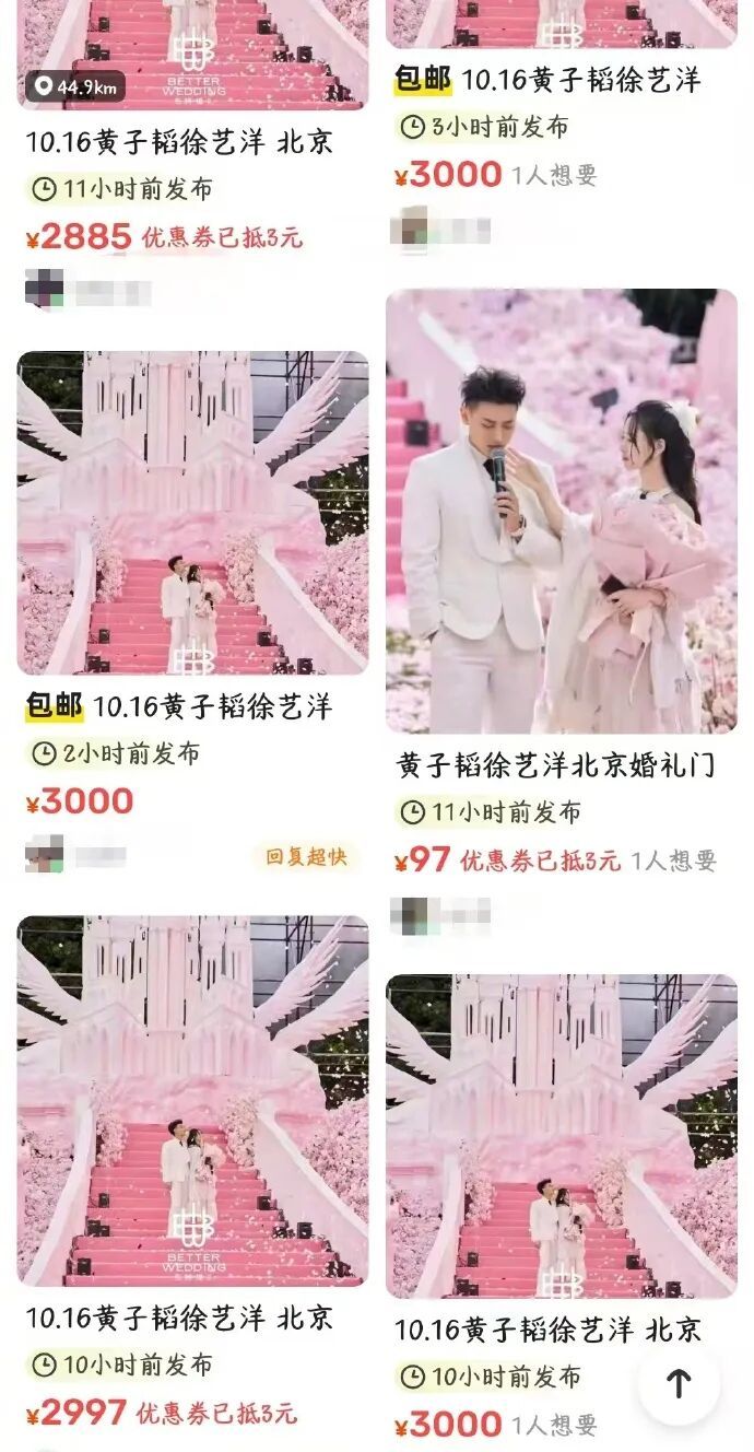 據揚子晚報10月14日消息,二手平臺上出現了不少黃子韜徐藝洋婚禮黃牛票,產品宣傳文案大多都提到可與藝人合影,可進婚禮現場,還有部分黃牛宣稱現場有張藝興、鹿晗、王俊凱等明星,但該信息并無官宣來源。