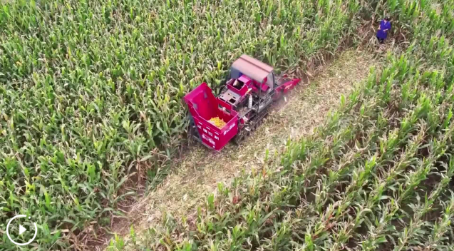 在河南省新鄉市衛輝市上樂村鎮的農田中,履帶式收割機正在玉米田間推進。為搶抓雨歇間隙,每臺收割機都配備兩三名機手,只要天氣和墑情允許,收割機就不間斷進行收獲作業。