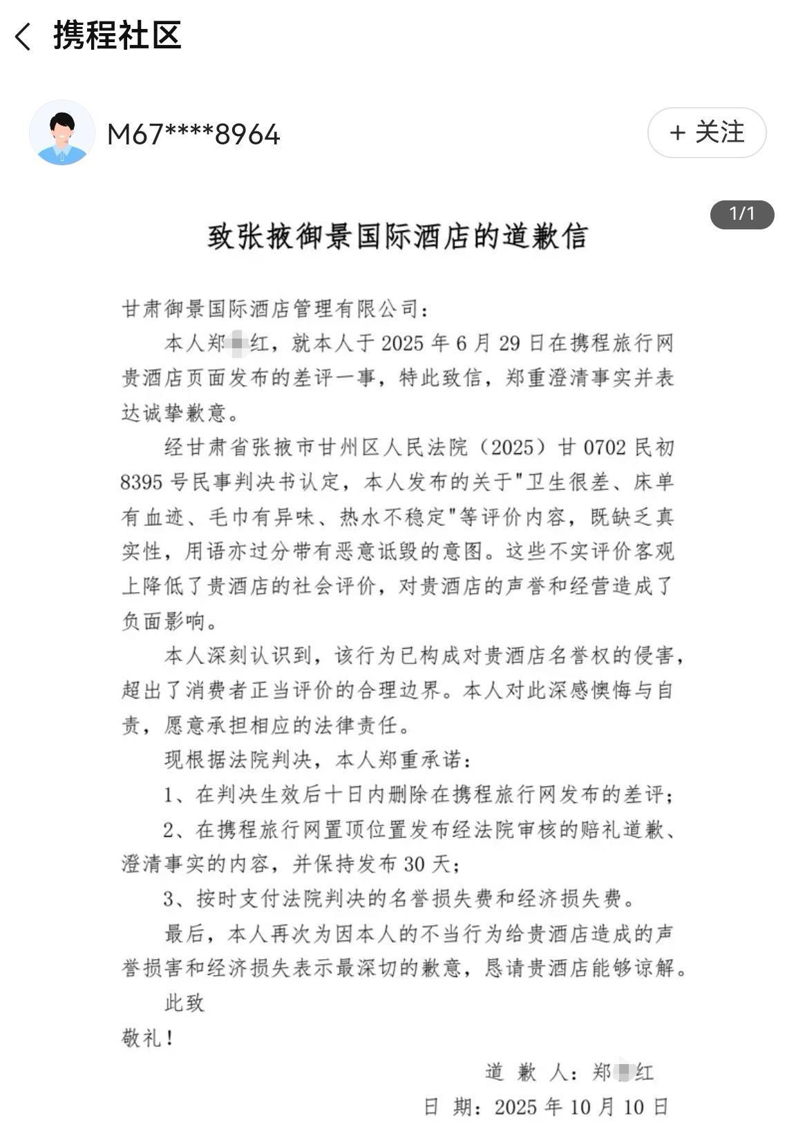 這封《致張掖御景國(guó)際酒店的道歉信》寫道:本人鄭某紅,就本人于2025年6月29日在攜程旅行網(wǎng)貴酒店頁面發(fā)布的差評(píng)一事,特此致信,鄭重澄清事實(shí)并表達(dá)誠(chéng)摯歉意。