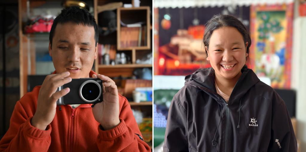 拼版照片:2025年10月10日,達瓦次仁在用手機拍照(左圖);達瓦次仁拍攝的妻子朋瓊(右圖)。