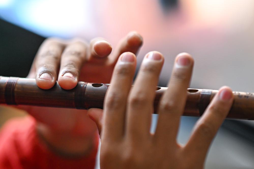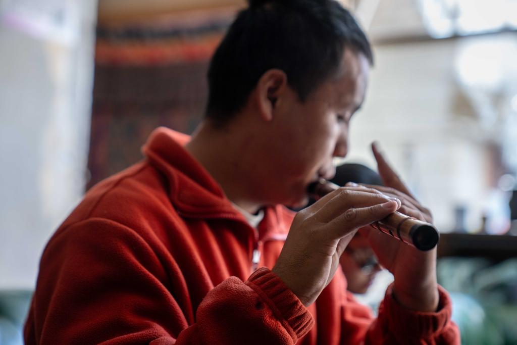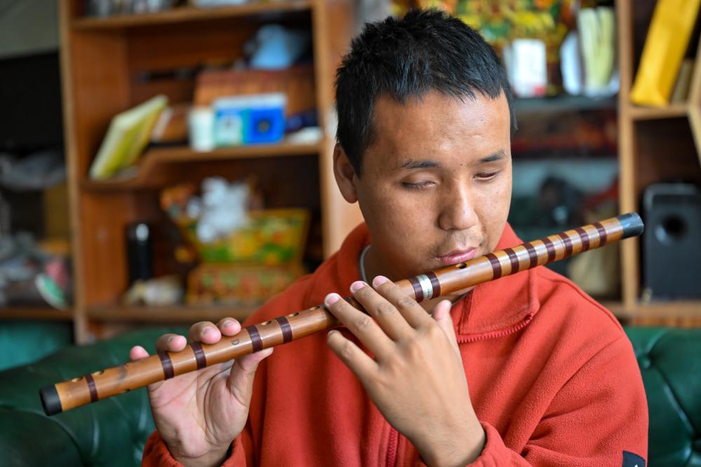 2025年10月10日,達瓦次仁在練習吹奏笛子。