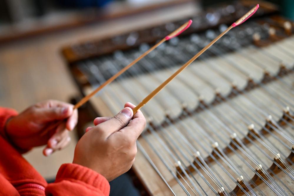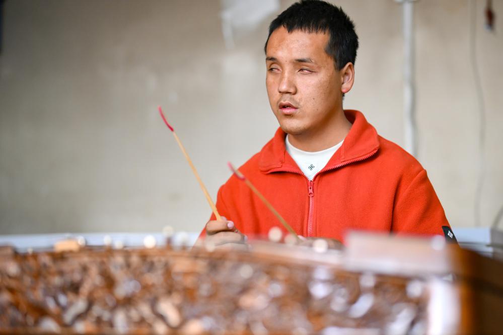 2025年10月11日,達瓦次仁在練習演奏揚琴。