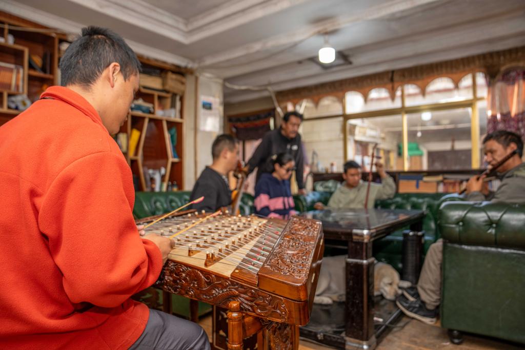 在其美多吉老師的悉心指導下,這群年輕人逐漸掌握了二胡、揚琴、扎念琴等傳統樂器,開始了朗瑪堆諧的表演生涯。“那會兒天不亮就起床,練三個小時才吃早飯,然后一直練到天黑。”樂團主唱次仁曲珍回憶道,“剛開始時,一兩個月才能學會一首曲子。”