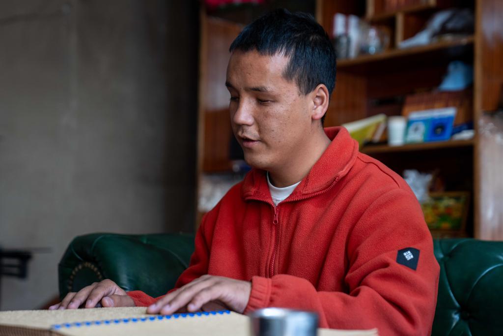 2025年10月10日,達瓦次仁在“閱讀”盲文書籍。