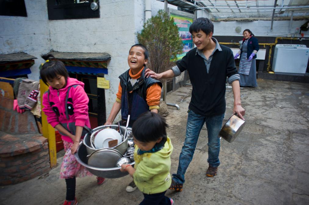 2013年10月12日,達瓦次仁(左二)跟同學們將洗好的餐具抬回廚房。