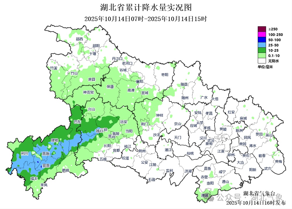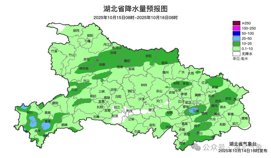 10月15日08時-16日08時,鄂西北、鄂西南陰天有小到中雨,局地大雨;其他地區多云到陰天有短時小雨,局地中雨或大雨。最高氣溫鄂東南25~28℃、其他地區20~25℃,最低氣溫16~20℃,偏北風2到3級、陣風4到5級。