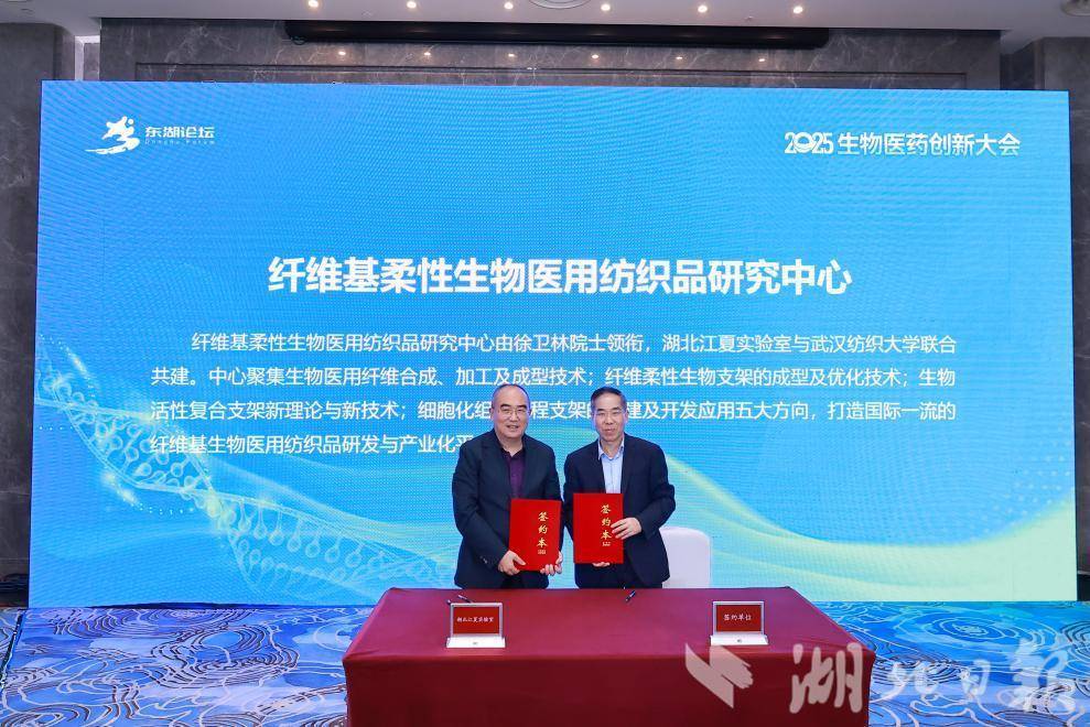 作為本次大會的核心環(huán)節(jié),湖北江夏實驗室現(xiàn)場發(fā)布六大共建技術平臺并舉行簽約儀式:與華中農(nóng)業(yè)大學金梅林院士團隊共建“全健康前沿交叉創(chuàng)新中心”,聚焦病原預警檢測及寵物創(chuàng)新藥開發(fā)等五大方向;聯(lián)合武漢紡織大學徐衛(wèi)寧院士團隊成立“纖維基柔性醫(yī)用生物紡織品研究中心”,突破生物醫(yī)用材料關鍵技術;與華中科技大學劉劍峰教授團隊共建“智能化蛋白質(zhì)研究中心”,推動功能性蛋白質(zhì)開發(fā)及成果轉(zhuǎn)化;與中南醫(yī)院合作共建“醫(yī)工交叉概念驗證中心”,打造國內(nèi)領先的一站式醫(yī)工融合創(chuàng)新轉(zhuǎn)化平臺;與遠大醫(yī)藥共建“聯(lián)合創(chuàng)新研究中心”,推動創(chuàng)新藥物研發(fā)與技術轉(zhuǎn)化;與天勤生物合作成立“AI醫(yī)藥研發(fā)非臨床研究中心”,建立基于AI輔助醫(yī)藥研發(fā)的藥理、藥效研究及毒性評價體系。
