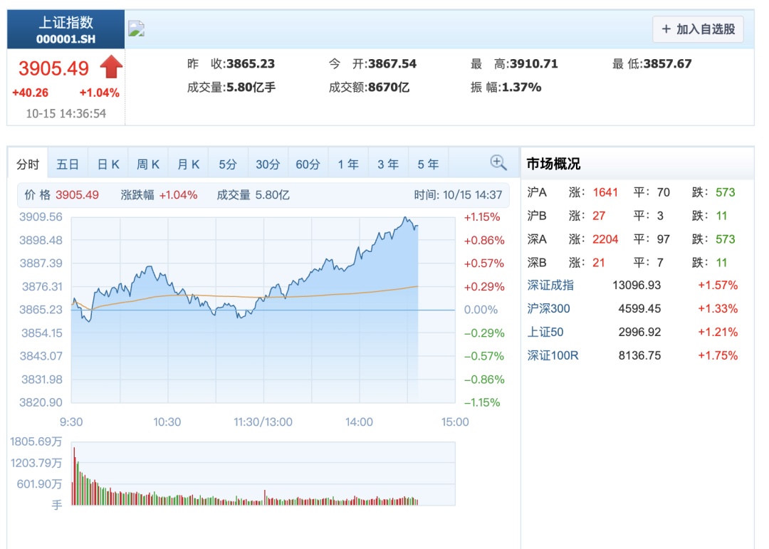 人民財訊10月15日電,截至發稿,滬指漲幅擴大至1%,重回3900點。