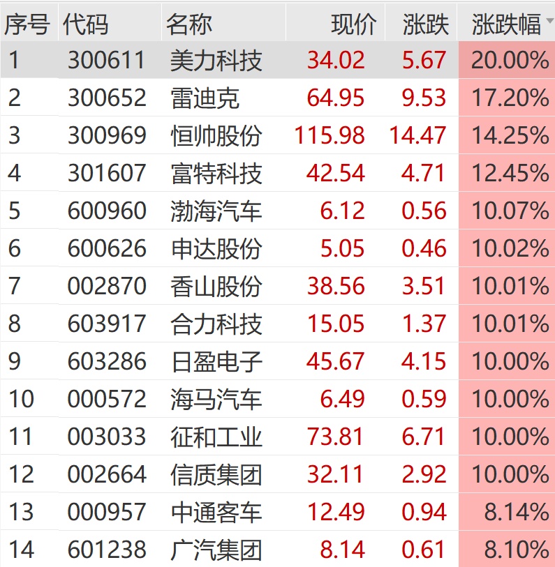 汽車板塊突現漲停潮,美力科技、渤海汽車、申達股份等多股漲停。