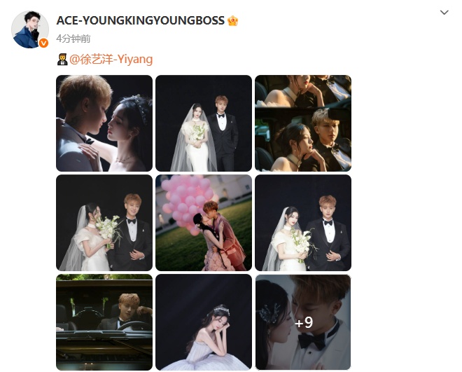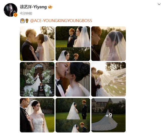 15日,黃子韜徐藝洋婚紗照公開,兩人各曬出不同的18張婚紗照,并@對方。照片中,兩人在草坪上擁吻,將浪漫拉到極致;還有兩人坐在車上、臺階上,幸福美滿。