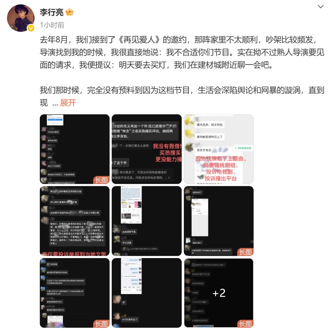 10月13日,歌手李行亮曾發(fā)長文回應(yīng)在《再見愛人》中的爭議表現(xiàn),稱遭到大規(guī)模網(wǎng)暴。他曬出多張遭舉報的截圖,透露因為這檔節(jié)目,生活會深陷輿論和網(wǎng)暴的漩渦,邀自己演唱主題曲的劇組被騷擾、電視劇被投訴、播出平臺也遭投訴。