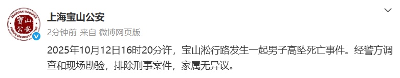 2025年10月12日16時20分許,寶山淞行路發生一起男子高墜死亡事件。經警方調查和現場勘驗,排除刑事案件,家屬無異議。