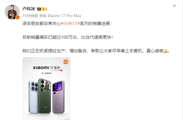 10月2日,開售第六日,盧偉冰在社交平臺發(fā)文稱,小米17系列目前銷量已超過100萬臺,比往代速度更快,小米正在抓緊提拉生產(chǎn),增加備貨。