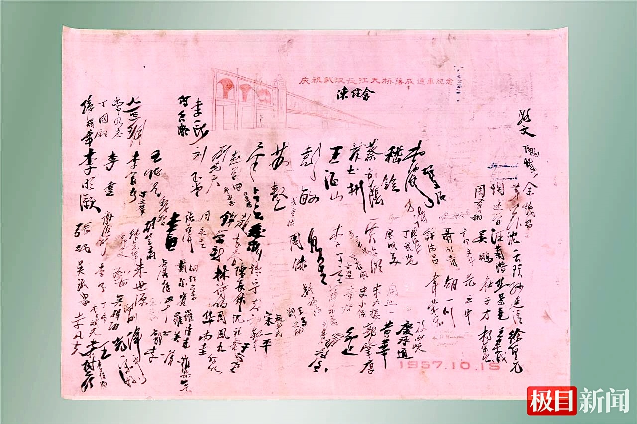 楚天都市報(bào)極目新聞?dòng)崳ㄍㄓ崋T邢影)一方粉色的絲綢,密密麻麻上百個(gè)簽名,共同見證了新中國橋梁建設(shè)的重要?dú)v史時(shí)刻。10月15日,正值武漢長江大橋通車68周年紀(jì)念日,橋梁博物館正式公開展陳“1957年10月15日武漢長江大橋通車儀式參加者簽名”,為觀眾打開一扇回望歷史的窗口。