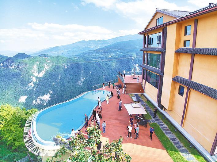 10月12日,巴東縣茶店子鎮懸崖民宿群內,游客正在眺望峽谷風光,打卡網紅觀景平臺。