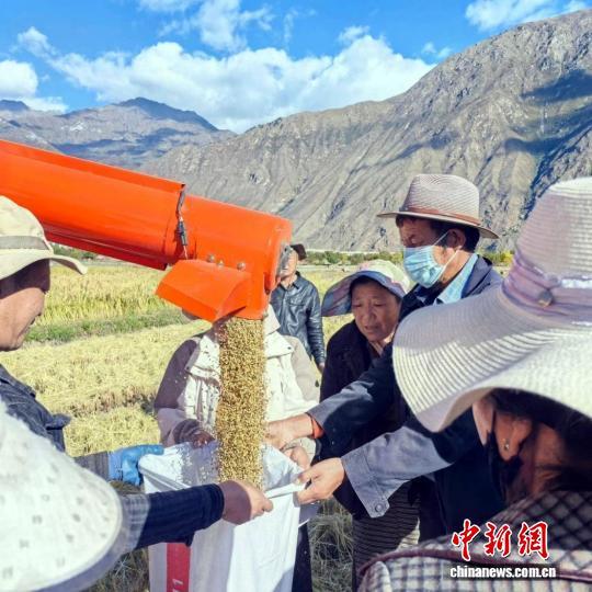 中新網拉薩10月15日電 (趙延 胡可新)"以前覺得在高原種水稻是天方夜譚,現在我們都吃上了自己種的大米!"共康村村民手捧沉甸甸的稻穗,喜悅之情溢于言表。西藏自治區山南市加查縣冷達鄉共康村近日迎來高原水稻豐收。經實地測產,今年平均畝產達1137.62斤。